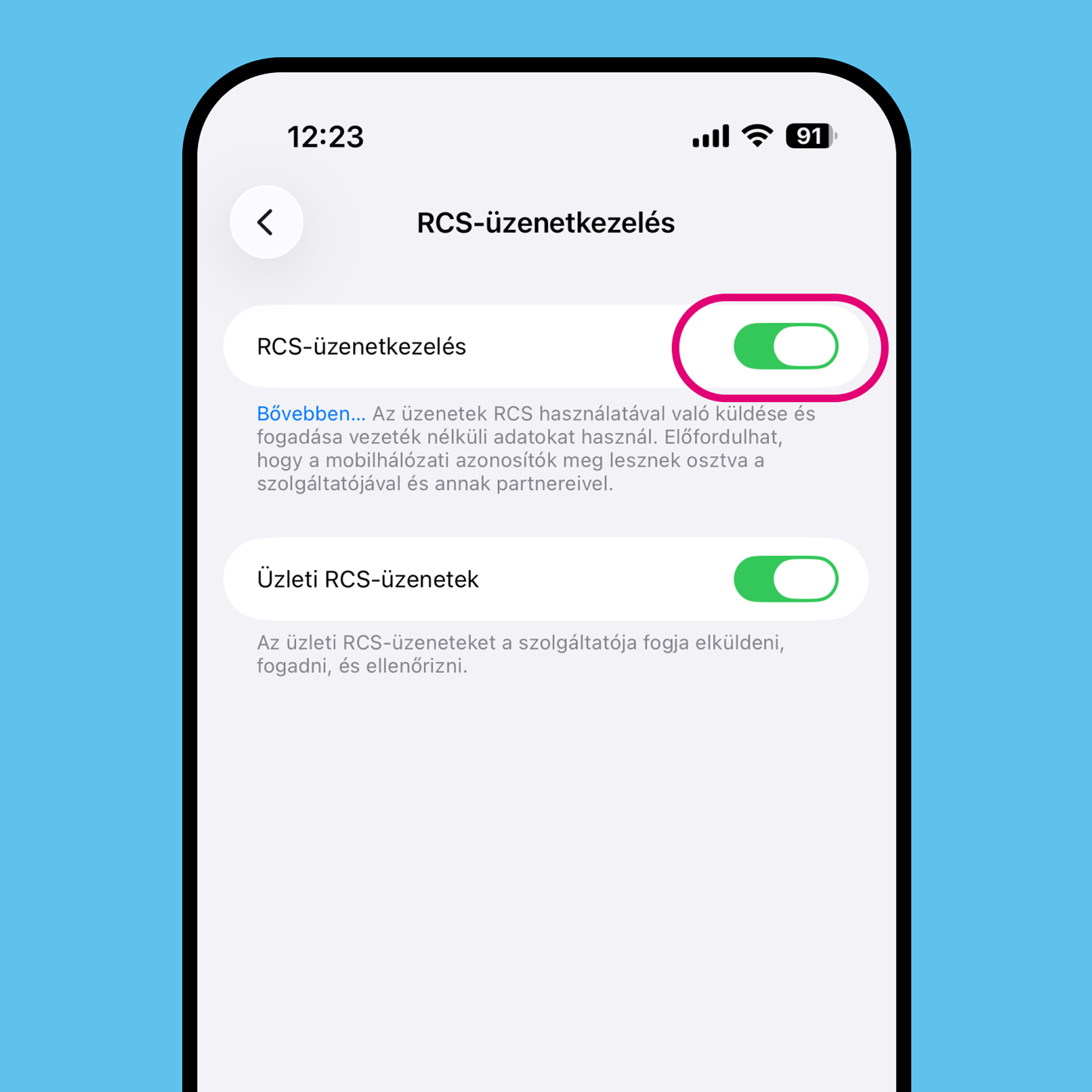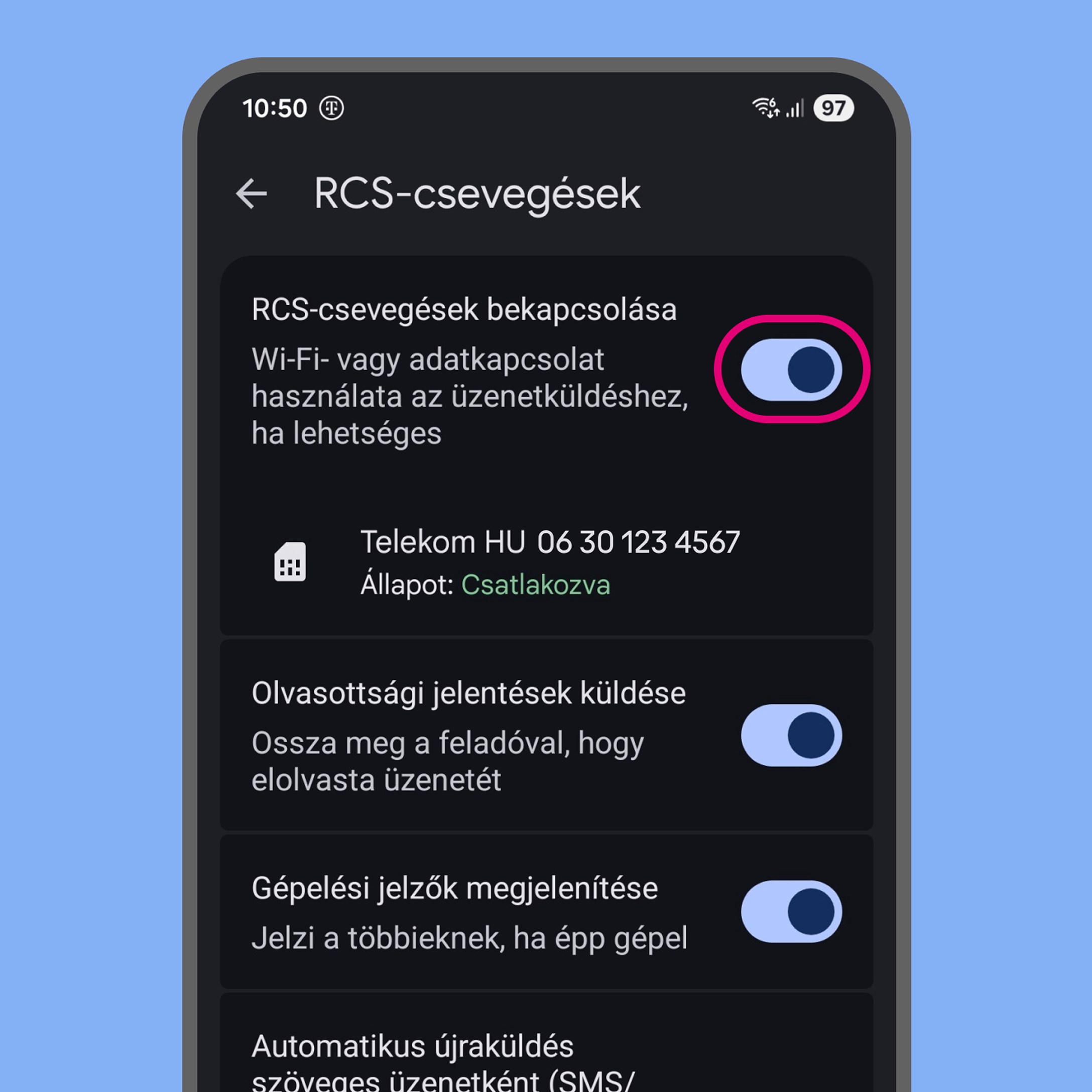 - Kapcsold be a telefonodon az RCS üzenetküldést lehetőséget